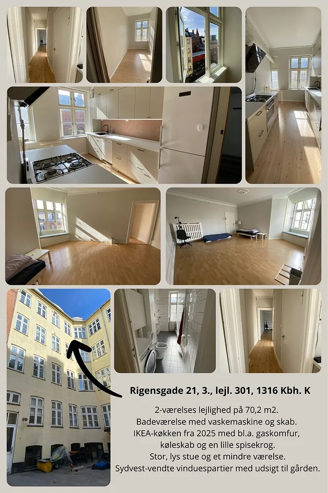 Der er et ledigt lejemål i Rigensgade: 3. sals lejlighed på 70,2 m2 fordelt på stue, værelse, køkken, bad og gang. Nyt køkken fra 2025.